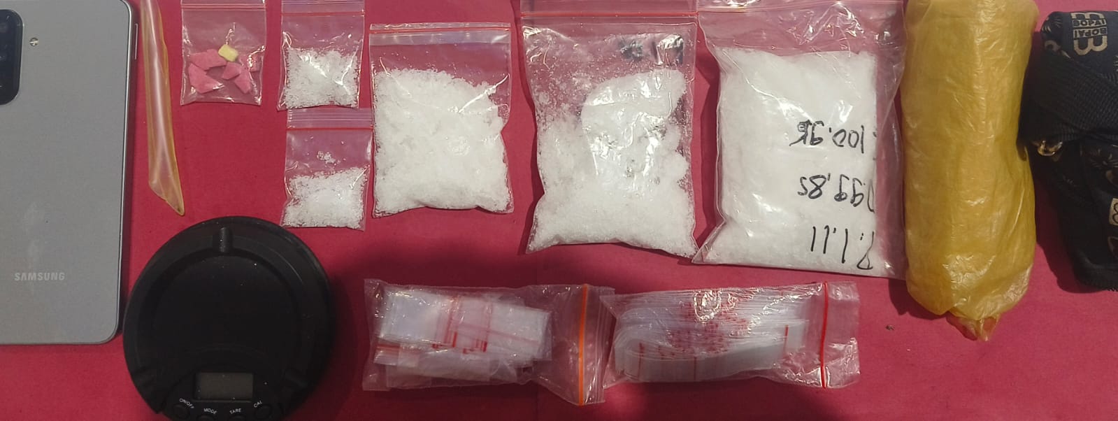 Sedangkan BB yang disita dari tangan terangka R P yakni dua paket sabu berukuran kecil seberat 3,88 gram dan satu paket daun ganja dengan berat kotor 5,04 gram, serta setengah butir pil ekstasi warna merah dengan berat kotor 0,21 gram. Kemudian dua ball plastik bening klip merah, sendok dari pipet plastik, dua unit telepon genggam, dan sebuah kotak warna hitam tempat menyimpan narkotika.